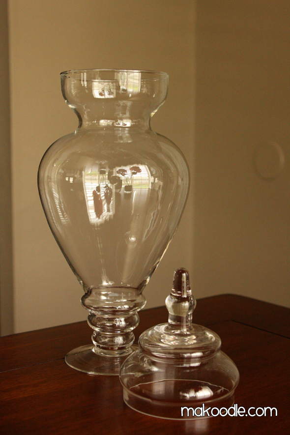I love decorating with apothecary jars. I think they are especially fun to decorate with for the holidays. I had an idea to use beans as filler for one of my apothecary jars. It all started out great, until I had to re-arrange and use a different jar for my bean filler.
