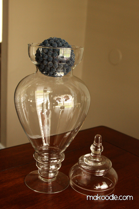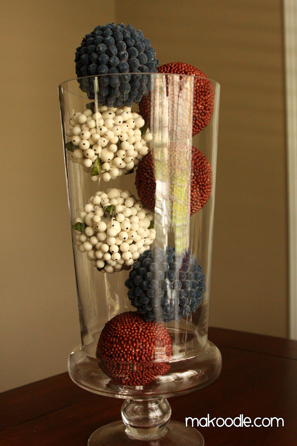 On to plan B. I tried my larger apothecary jar. The patriotic balls fit, but they looked kind of silly because they were staggered back and forth.
