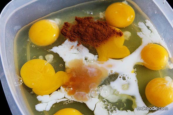 Put eggs, milk, vanilla, and cinnamon in a container.