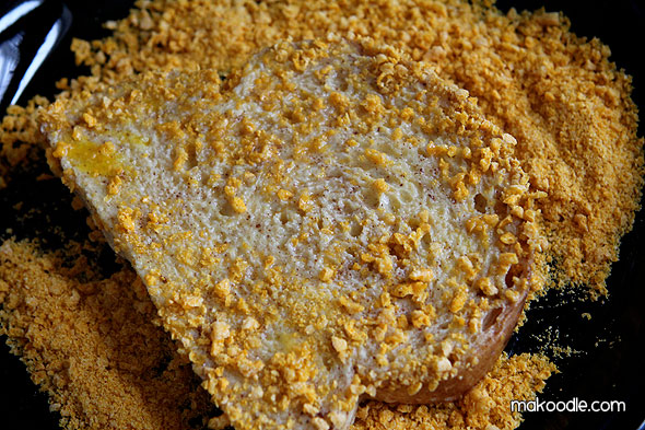 Coat each side of the bread with the crushed Cap’n Crunch.