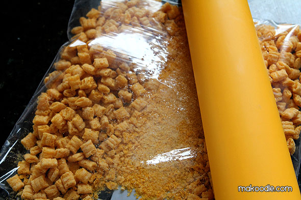 Crush Cap’n Crunch pieces using a rolling pin.
