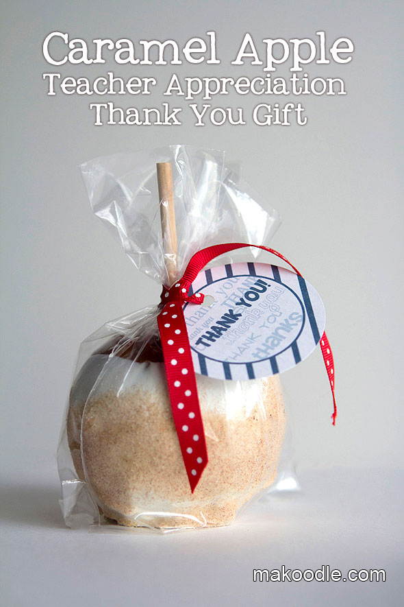 This is an easy teacher appreciation gift idea. You can pick up the caramel apples from a local treat shop. I picked mine up at Kneaders for only $4. (I say only $4 because I checked Rocky Mountain Chocolate Factory and their caramel apples were almost $8!)