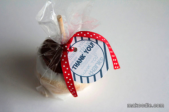 The caramel apple packaging is really quite easy to put together. All you do is place the caramel apple in a cellophane bag, then tie ribbon around the base of the wooden stick. Cut out the thank you tags (printable available below), and punch with a 3 inch punch. Tie the thank you tag to the ribbon and viola!