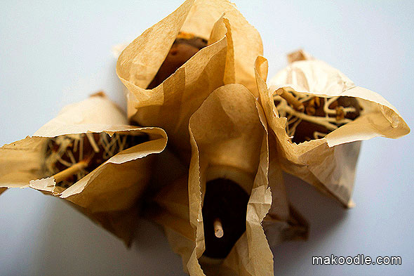 This is the adorable packaging the caramel apples came in – brown paper packages. They were in serious need of a makeover so I headed straight to the craft supplies.