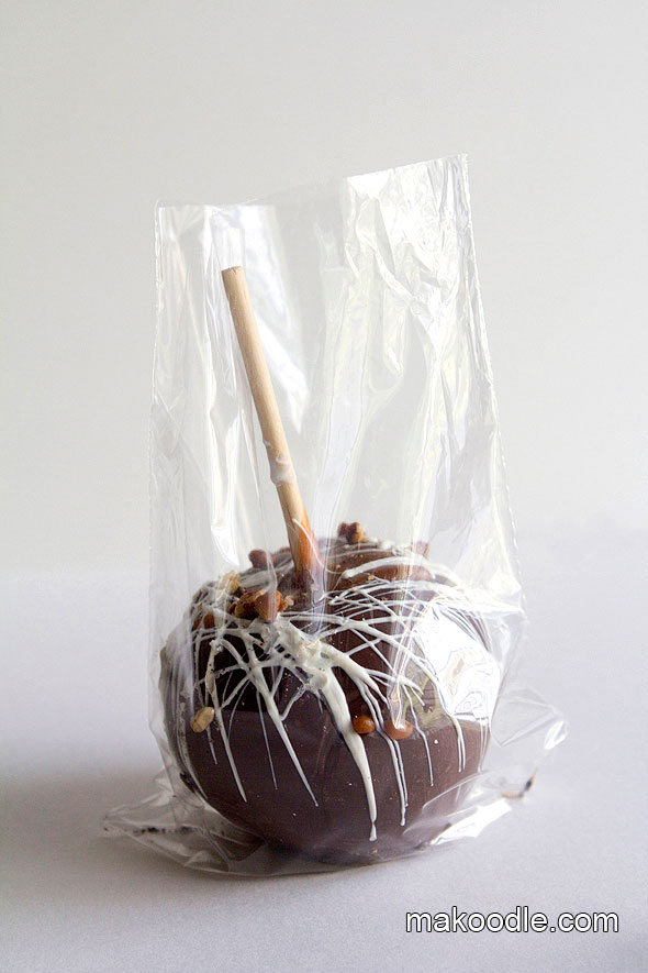 By packaging the caramel apple in some cellophane, ribbon, and a thank you tag, you have a quick and fancy thank you gift.