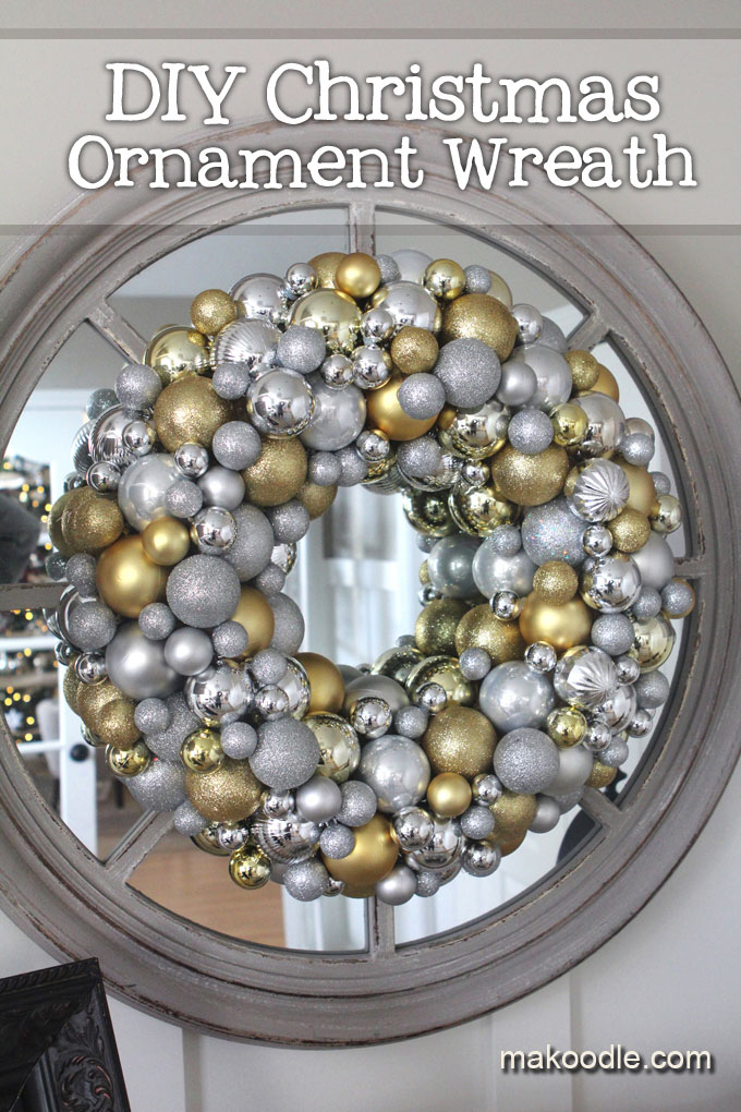 Make sure to use shatterproof ornaments. It will make your wreath more resilient and lighter when you hang it. Final tip – make sure you make this on a surface that you’re ok with hot glue dripping down. I made ours on our kitchen table that has a layer of glass. I quite a few spots where glue oozed down to the table. I guess the alternative is to be careful about how much glue you use!