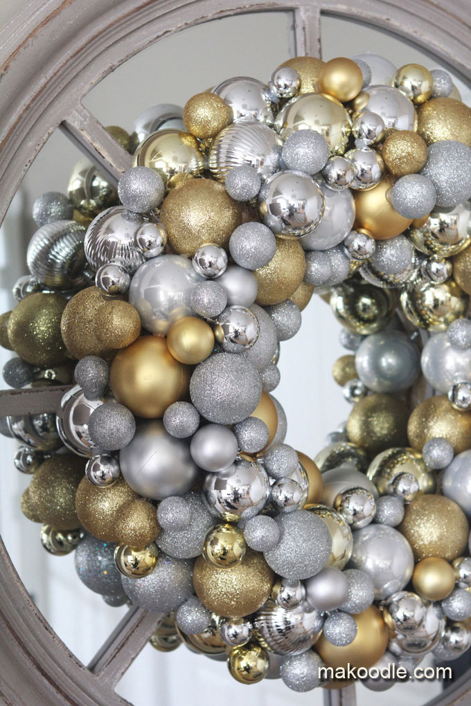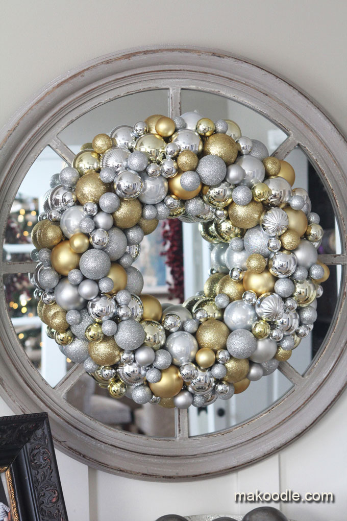 After you have your two rows, it will looks similar to the picture above. Notice the bare space in between the second layer ornaments. It will depend on what size of ornaments you use and the size of your wreath, but the bare space will by filled in with smaller ornaments.