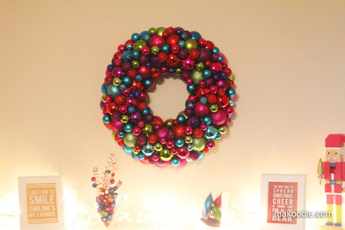 I have an area downstairs that is where i put all my colorful, whimsical Christmas decor. I am still working on the whole setup, but I knew a colorful ornament wreath was a must.