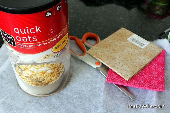 I knew I couldn’t be the only person that had experienced this dilemma so I did some researching on Google and found several ideas. My favorite idea and the one that seemed the easiest was to decorate a can of oatmeal. I saw this idea several places such as the Ribbon Retreat and Reenie Jae Creations. It turns out that an oatmeal can is the perfect size for holding headbands.