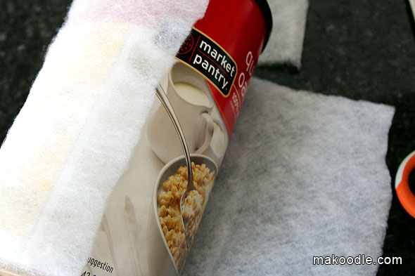 Cut the batting to the appropriate height and width so that it will wrap around the perimeter of the oatmeal can.
