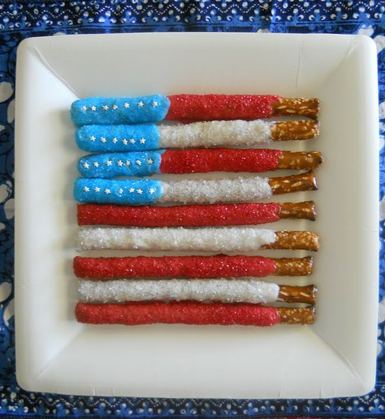 These patriotic, chocolate dipped pretzels would be a simple, easy treat to make with your kids.
