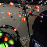 I found the skeleton hand party favors at a local craft store. To add them to the wreath, I hot glued some ribbon to the hands and pinned them at varying lengths to the wreath.