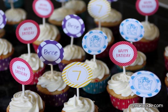 Oh how I love cupcakes. The only thing that makes cupcakes more lovable is when they coordinate with your birthday party theme. For Bree’s party, I designed some printable polka dot cupcake toppers to match the decor for the rest of the party.