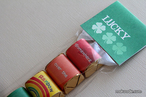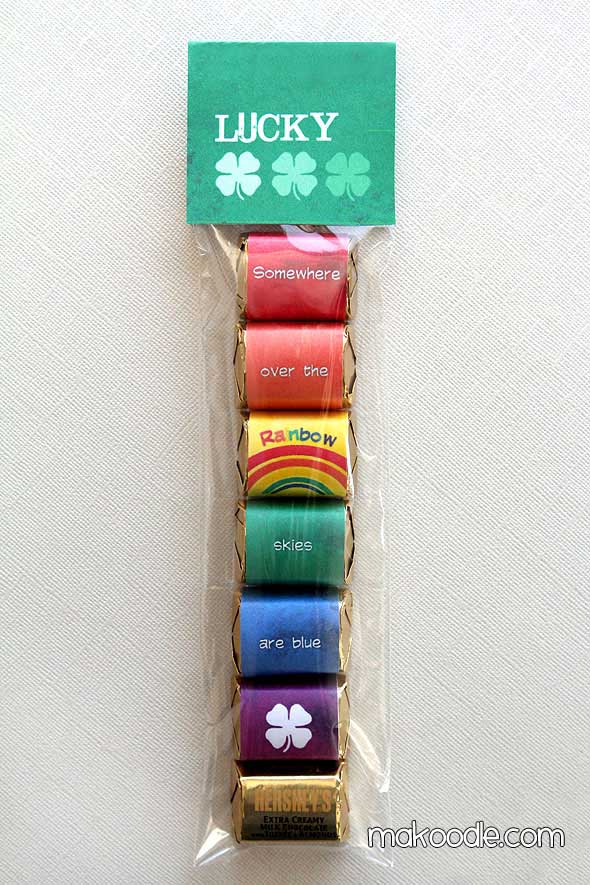 I have seen some cute rainbow treats for St. Patrick’s day here and here and thought it would be cute to make a Hershey Nugget treat printable.
