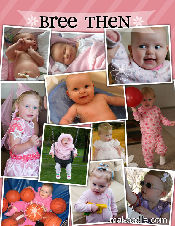 For the “then” collage, we picked some of her favorite pictures from the first few years of her life.  We stayed consistent with the layout and style by adding some Polaroid borders, and created a simple pink background (her other favorite color) and added a couple flower stamps for embellishment.  She wanted the collages to be all about her so we didn’t include any pictures of the rest of the family.