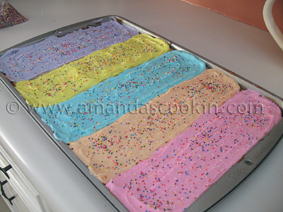 NOTES: I followed the recipe on this, the only thing I did differently was add more powdered sugar to the frosting because mine was too thin. I also used 5 different colors of paste food coloring. I cut the pan into five sections first using my dough cutter, then frosted one section and added sprinkles. Then I frosted the second section and sprinkles, third section and sprinkles, etc. After all the frosting was added I cut the sections into bars, again using the dough cutter.